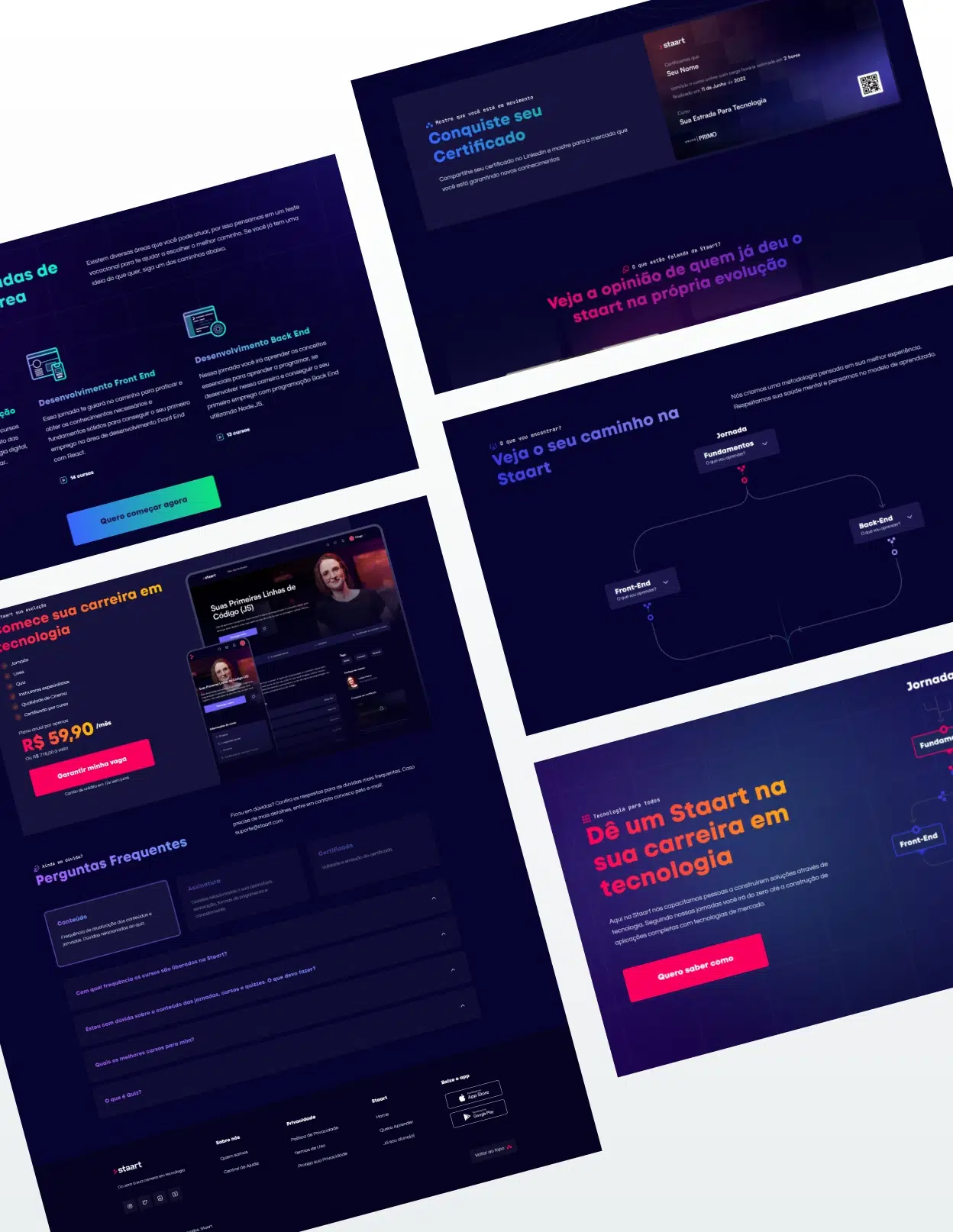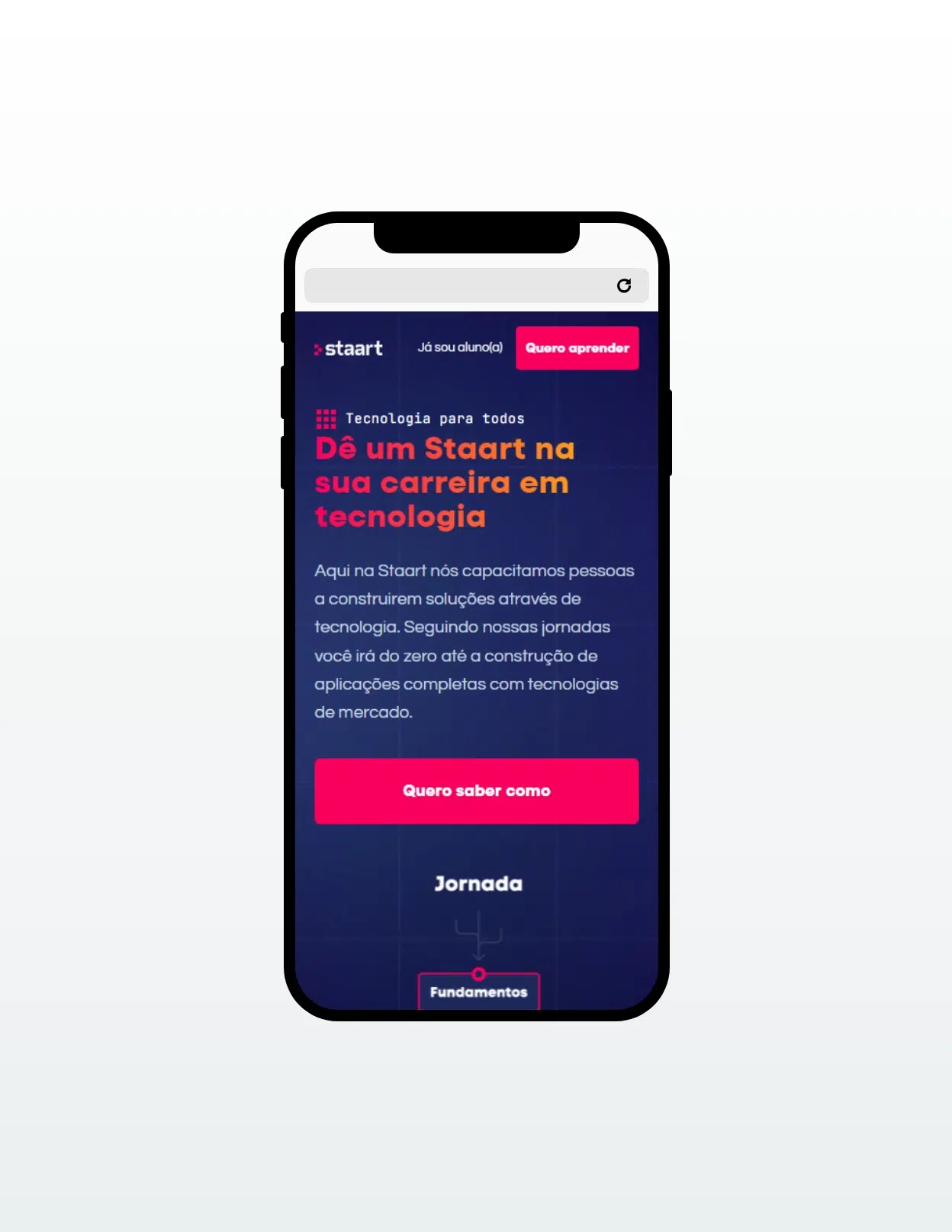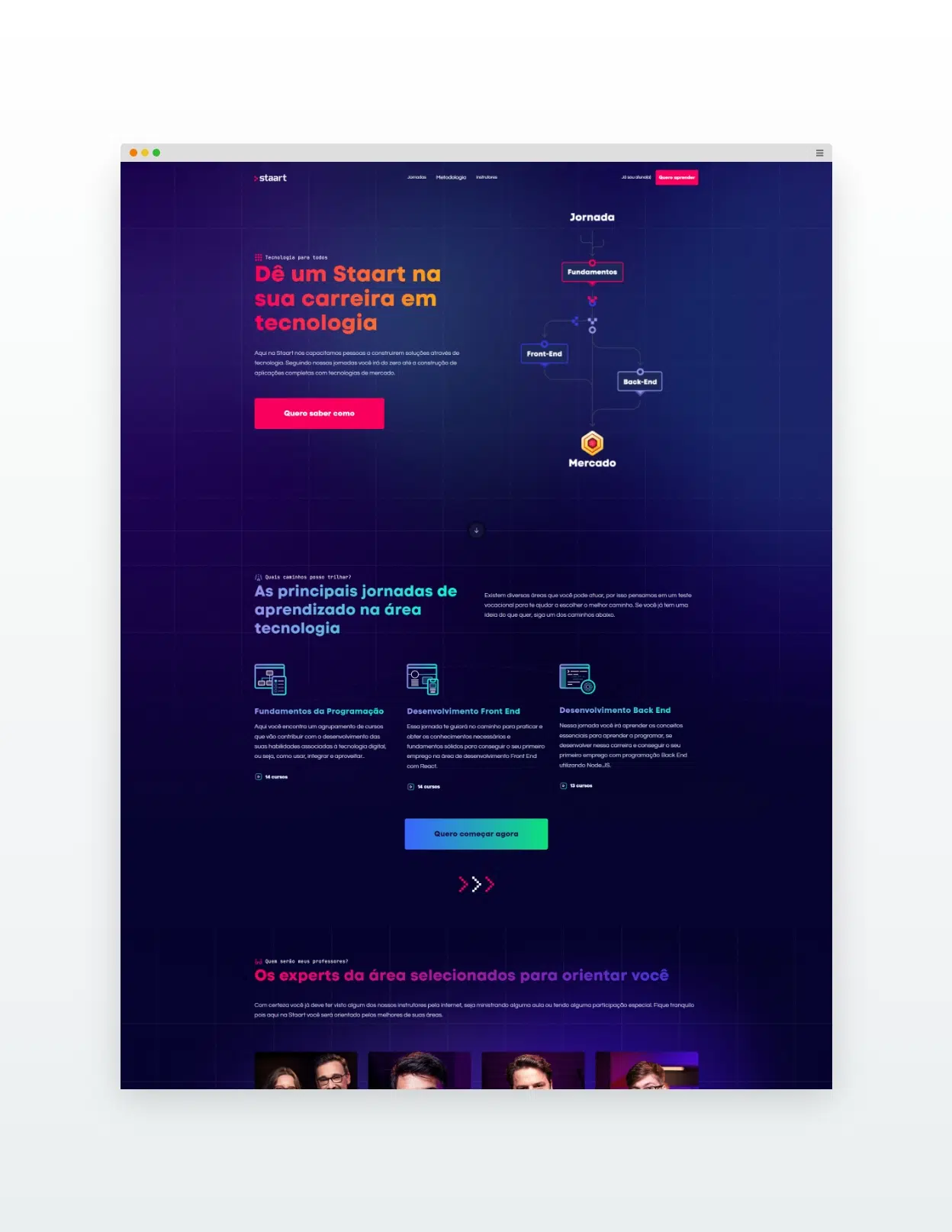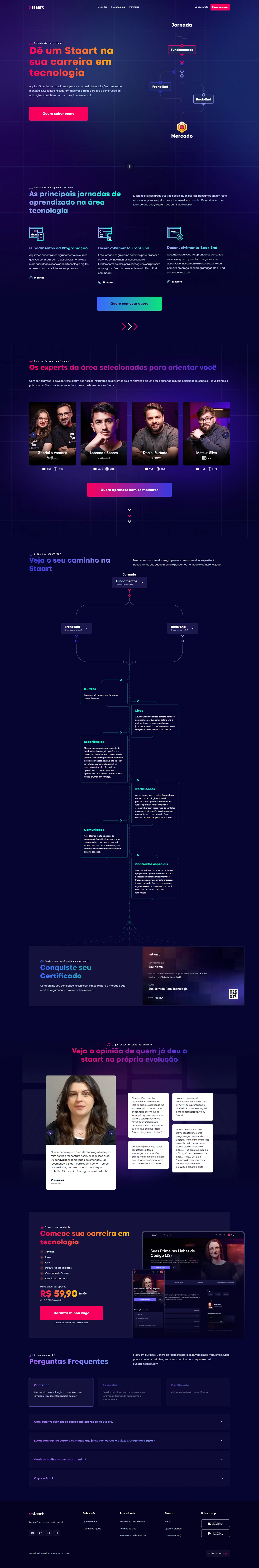 O projeto de reformulação da home da Staart teve como objetivo repensar toda a estrutura da página, desde o design até a programação front-end. A proposta envolveu a criação de um Design System robusto, garantindo a padronização visual e funcional dos componentes. Também foi dado ênfase à redistribuição dos elementos, organizando as seções de acordo com a jornada do usuário, de forma clara e intuitiva, e destacando os diferenciais de cada trilha de aprendizagem oferecida.