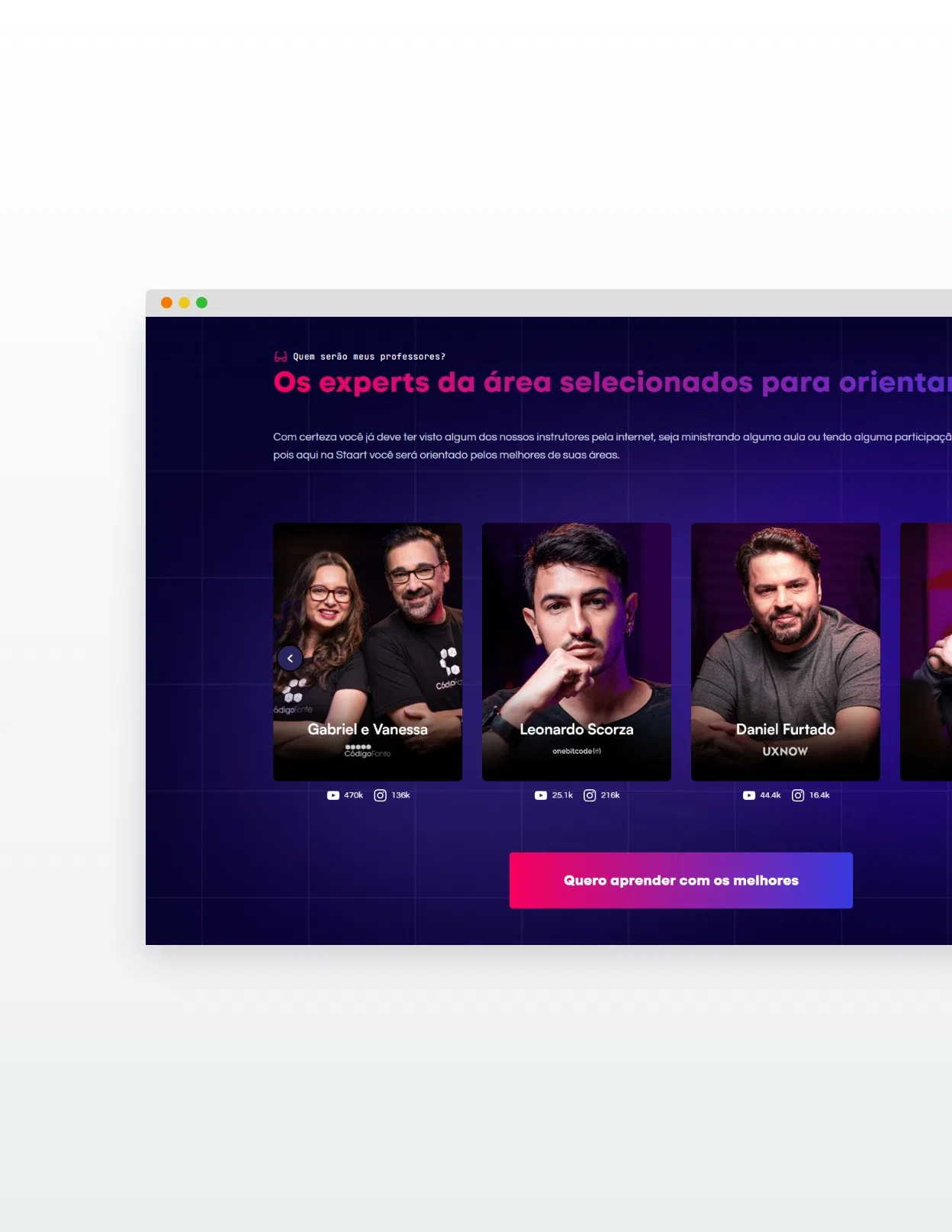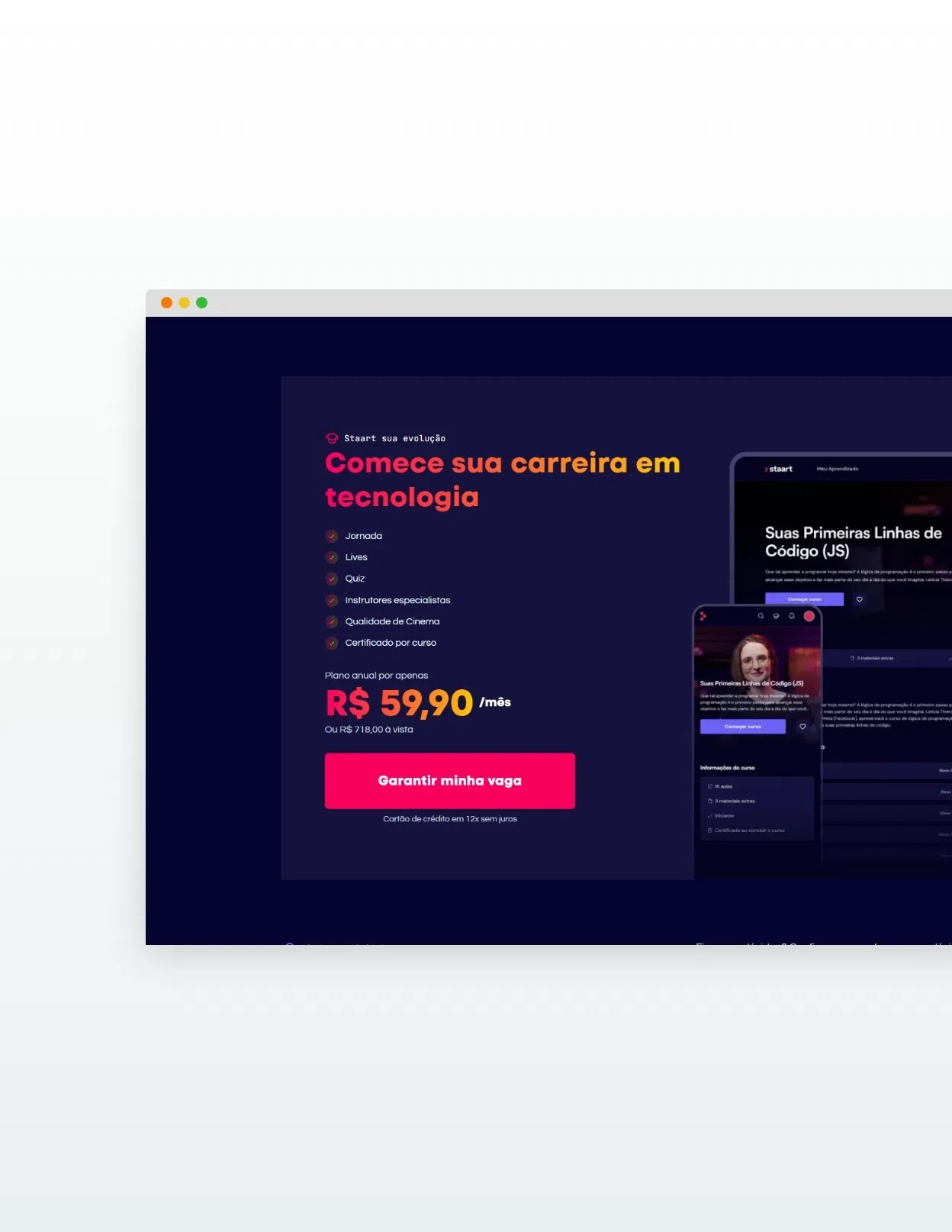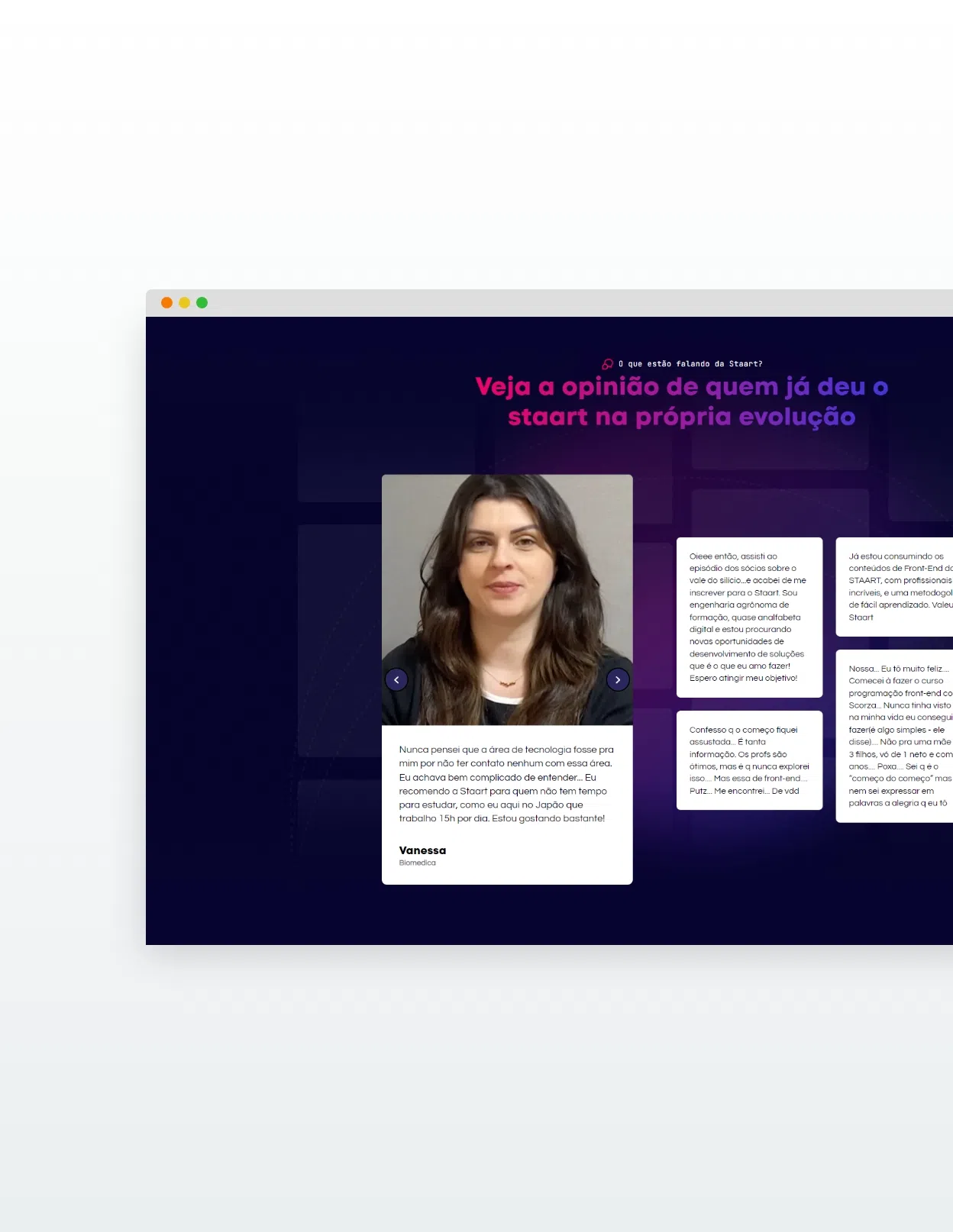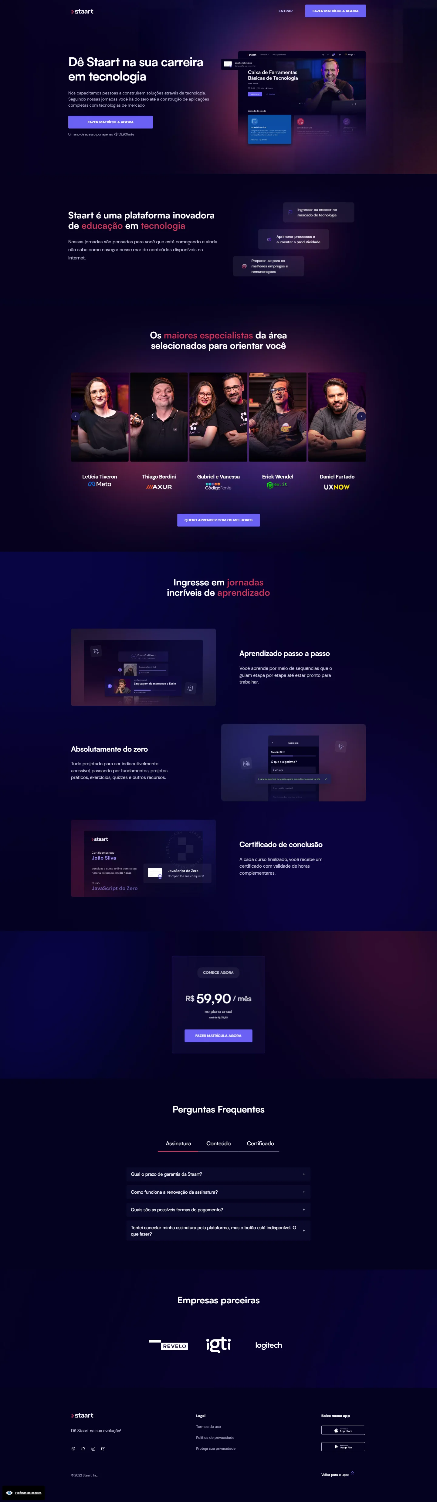 O projeto de reformulação da home da Staart teve como objetivo repensar toda a estrutura da página, desde o design até a programação front-end. A proposta envolveu a criação de um Design System robusto, garantindo a padronização visual e funcional dos componentes. Também foi dado ênfase à redistribuição dos elementos, organizando as seções de acordo com a jornada do usuário, de forma clara e intuitiva, e destacando os diferenciais de cada trilha de aprendizagem oferecida.