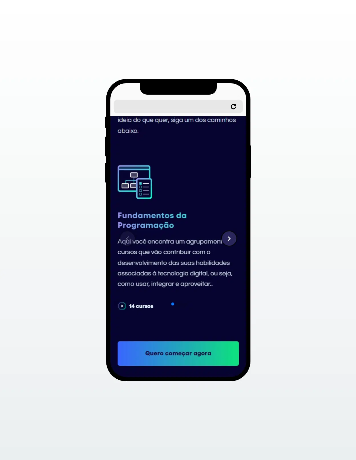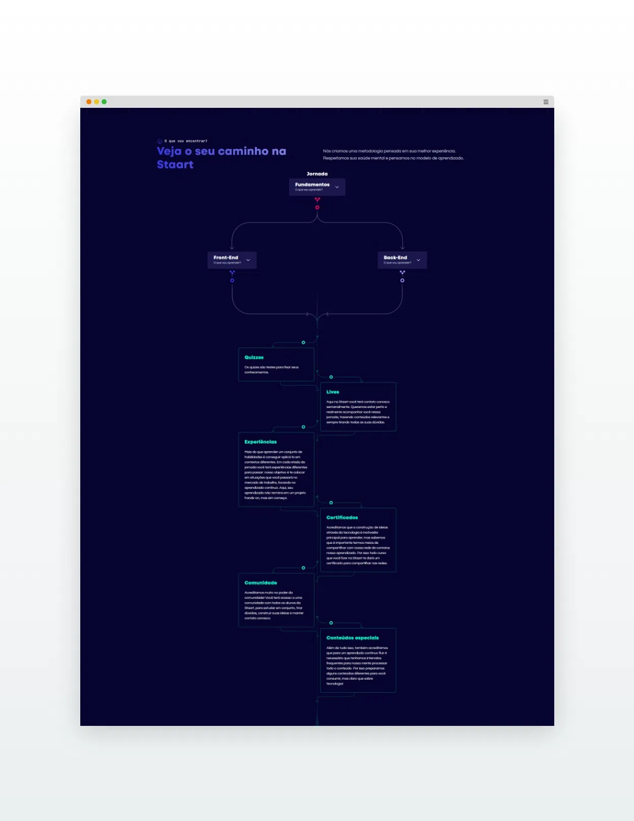 Uma das melhorias incluídas foi a animação do fluxo de estudos, representando de maneira interativa como os alunos podem seguir suas jornadas dentro da plataforma. Após aprender os fundamentos de programação, o aluno pode optar por seguir a trilha de Front-End ou Back-End, sempre com o foco final de se preparar para o mercado de trabalho.